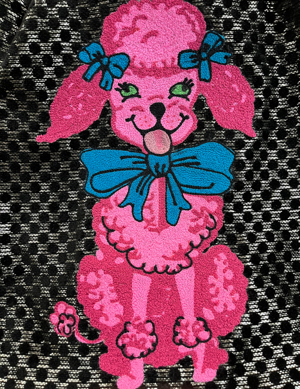 Retro FiFi poodle design is chainstitched to front with wool blend threads using a hand cranked chainstitch embroidery machine.
