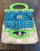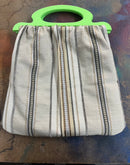 Fully lined with turquoise and lime green seersucker cotton fabric .