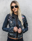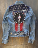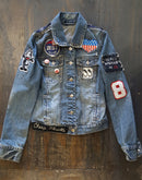FSLA One of a Kind Denim Jacket. Made with vintage denim jacket, hand embroidered, vintage , chainstitched and chenille patches. Felix the Cat, Cheap Thrills, I Wannabe in LA, Love and Rockets and more. Studded detail. Assorted lapel buttons.