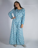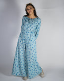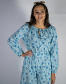 "Carly" Palazzo Jumpsuit Lightweight vintage white cotton fabric with blue floral print Off the shoulder with tie at the neck 2 inset side pockets Wide leg with a 30" inseam...