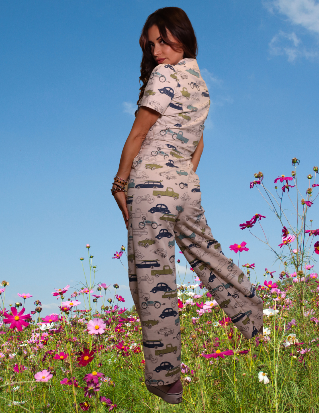 Drive Coverall Natural denim twill with vintage car and truck print 2 front pockets Zip up front Chest- 36" Waist- 30" Hip - 34" Front rise - 23" Inseam -...