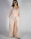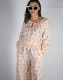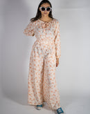 "Nina" Palazzo Jumpsuit Lightweight vintage cream cotton with orange floral print Off the shoulder with tie at the neck 2 inset side pockets Wide leg with a 30" inseam Elastic...