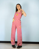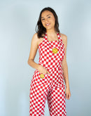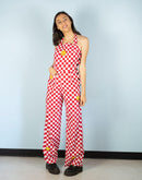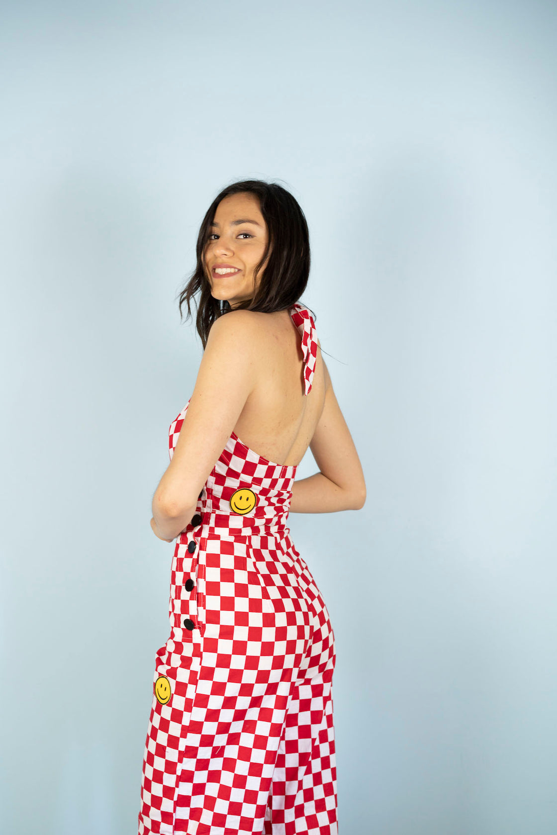 "SMILE! " Halter Overalls Cotton print red and white checkered cotton Ties at the neck Front hip pocket and bib pocket Vintage button side closure Chenille and embroidered smiley face...