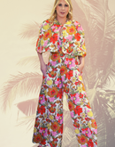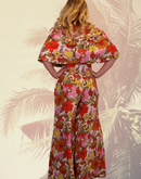 "Tangerine Dream" One of a kind Palazzo halter jumpsuit with matching cape Lightweight cotton fabric with colorful floral print Side pockets Tie at back of the neck Zip back Chest...