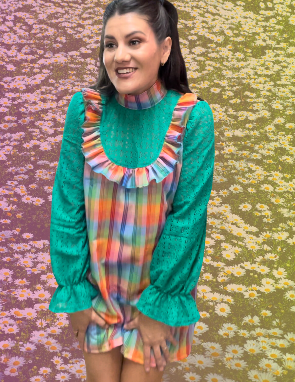 Dress to have fun in this colorful, handmade mini dress. With its vintage inspired design, playful retro vibes, and one-of-a-kind uniqueness, you can't help but have a big smile on your face. A must-have for anyone who loves fu...