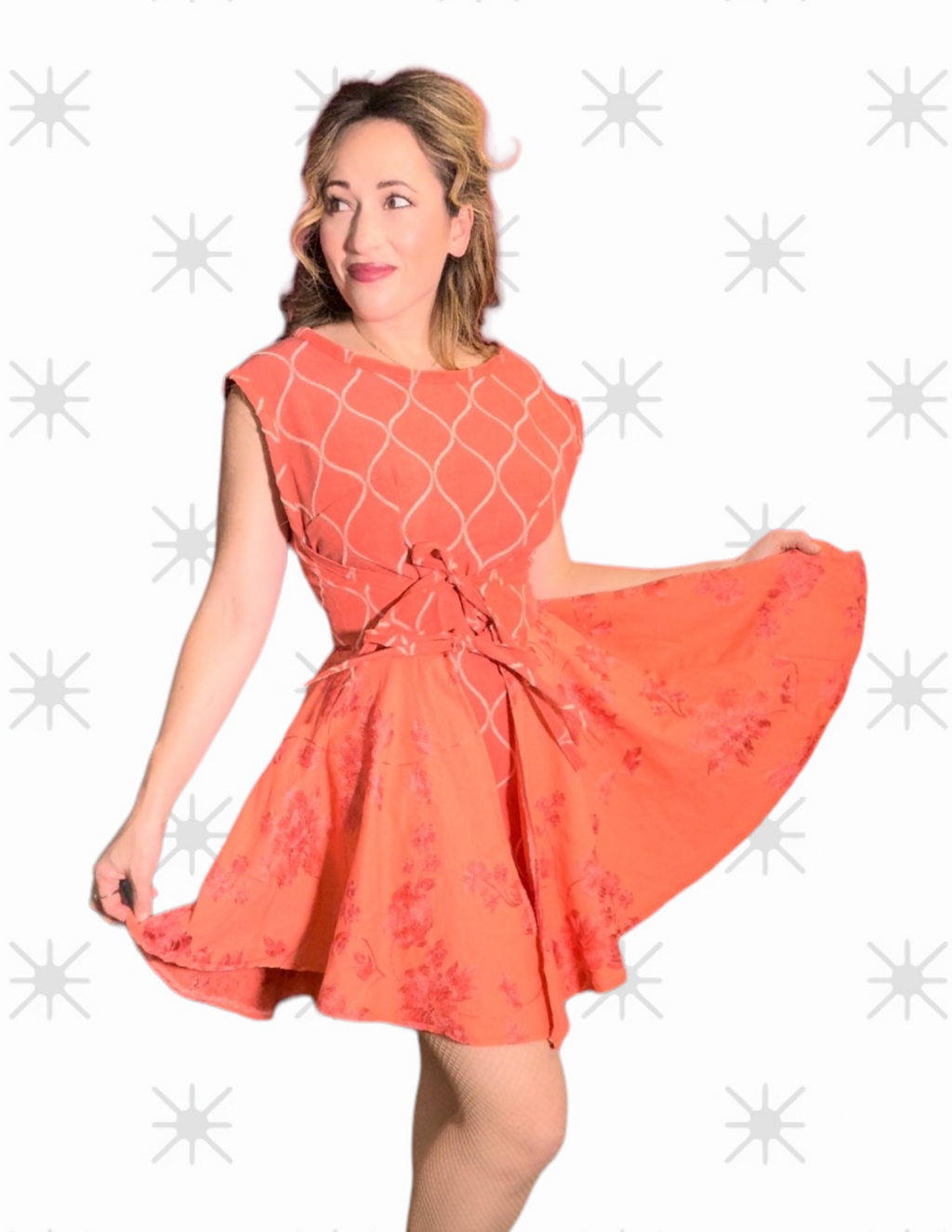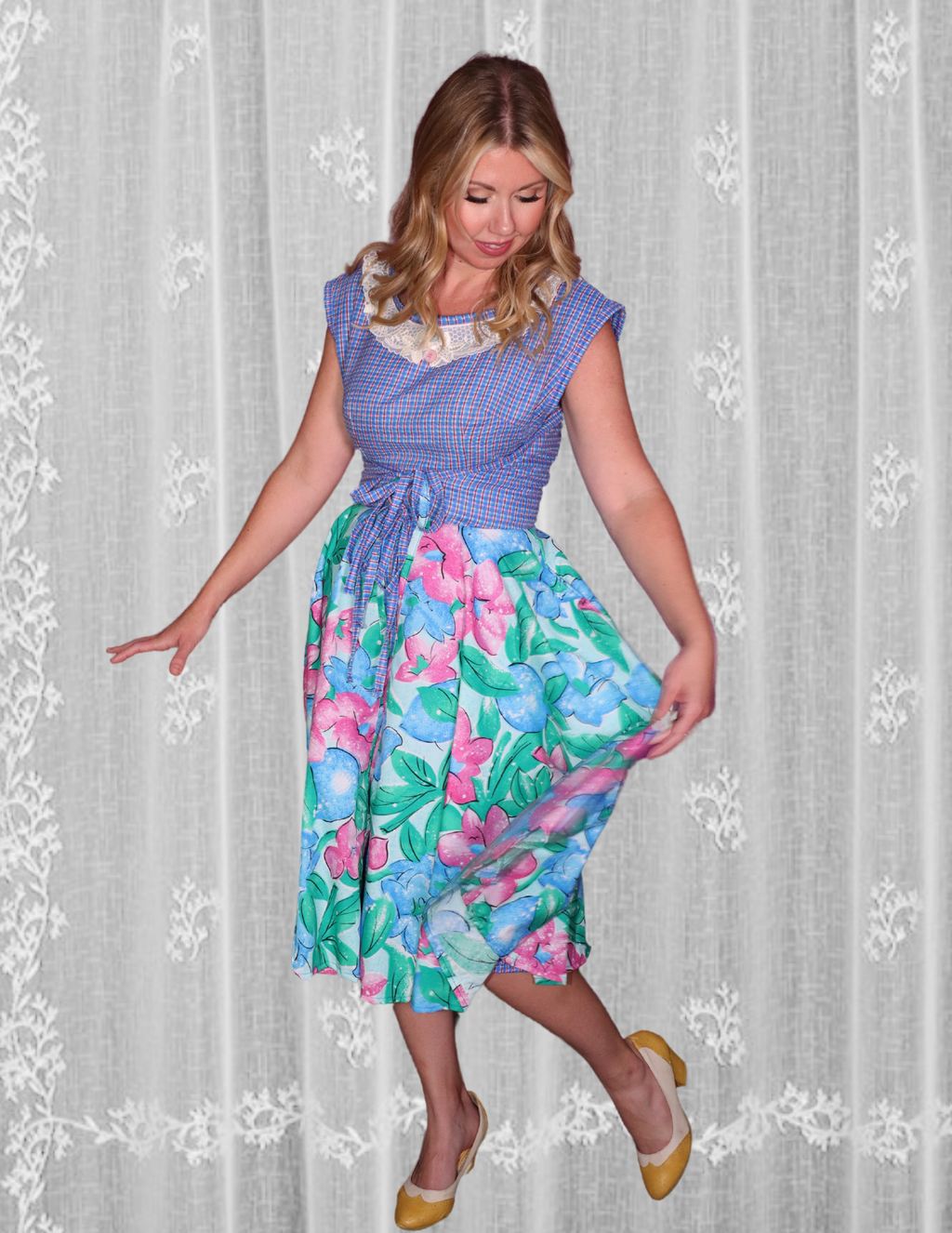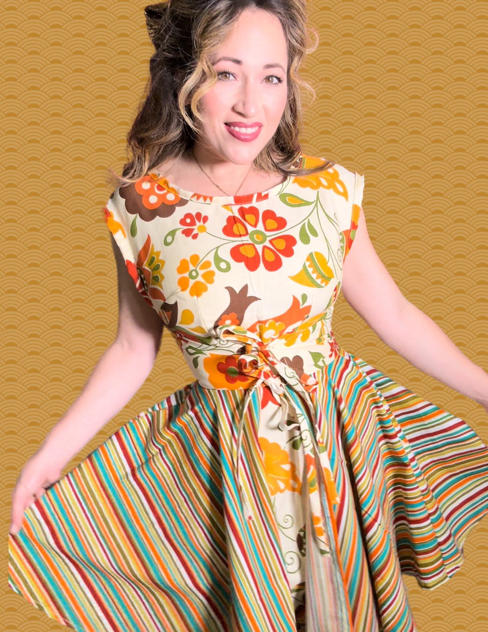 This knee-length, handmade dress channels vintage vibes and playful fun with its retro flowers and one-of-a-kind design. Perfect for any time you want to stand out!