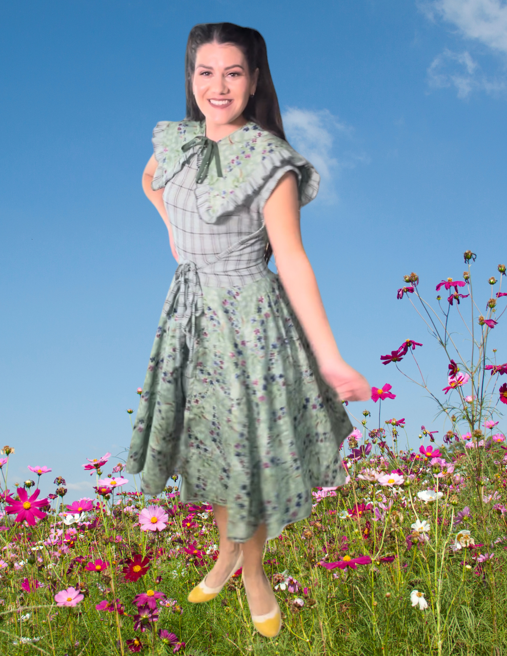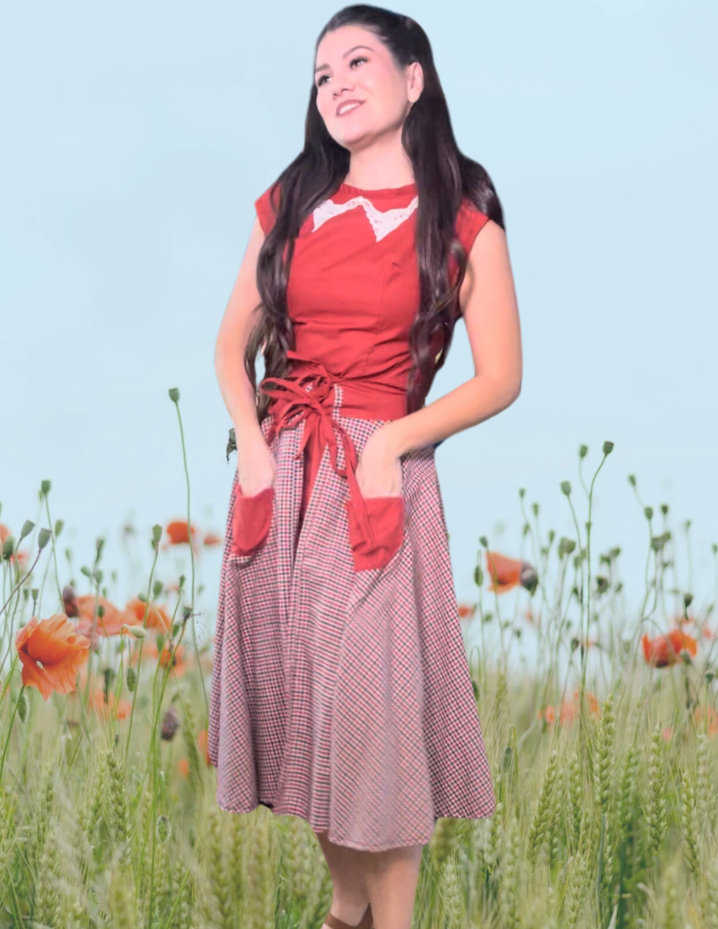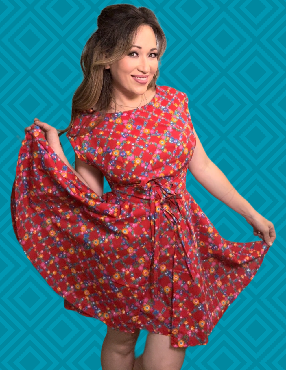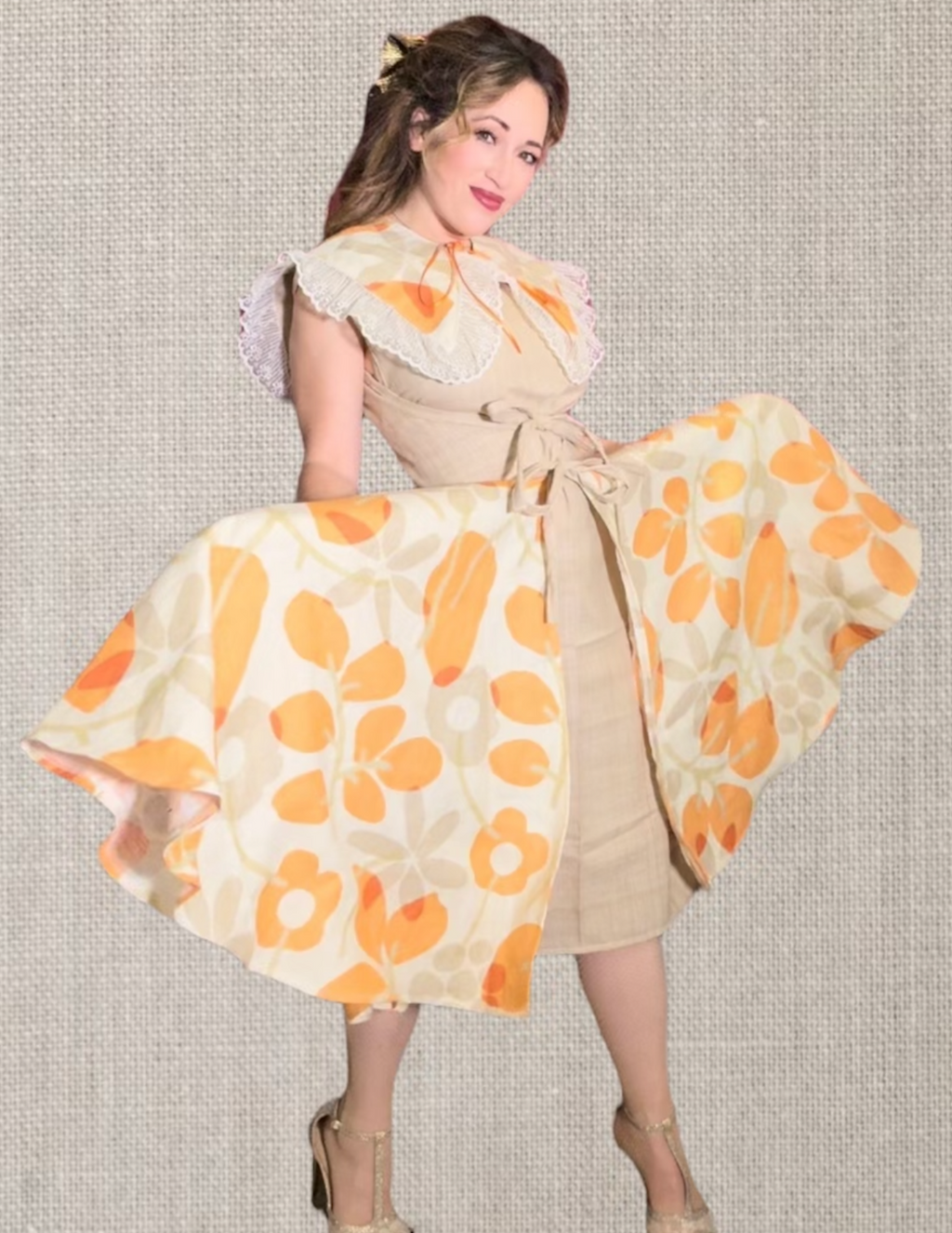 This knee-length, handmade dress channels vintage vibes and playful fun with its retro flowers and one-of-a-kind design. Perfect for any time you want to stand out!