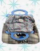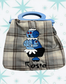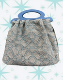 One of a kind handbag made using a pattern from the 1930s. Made with tan plaid front and tan/blue brocade back Custom 3D printed matte blue handles. Retro "Rosie" design...