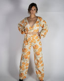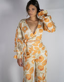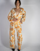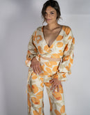 "Touched by the Sun" 2 piece set Wrap crop top with ruched long sleeves High waisted pants with front pocket Lightweight floral printed linen One of a kind SIze Small...