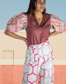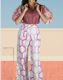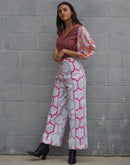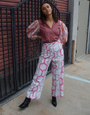 "Astoria" High Waisted one of a kind Pants with a side zip White twill with geometric pattern Front hip pocket Bottom cuff Waist- 28" Hips- 33" Inseam- 30" One of...