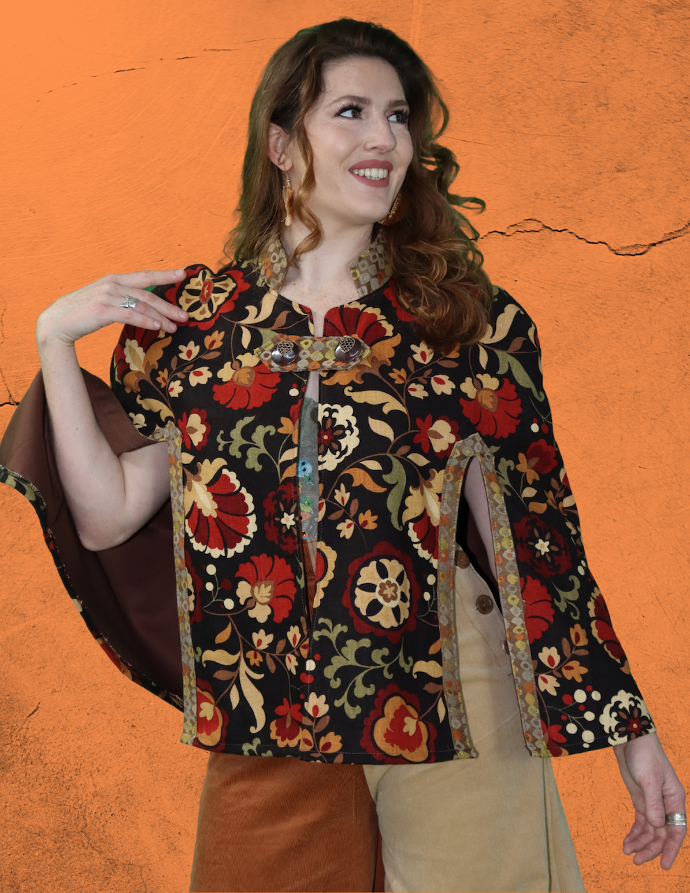 Get groovy with our "Pop Floral" Cape! This retro-inspired piece boasts a 1960s vibe and features vintage fabric, creating a one-of-a-kind look. Perfect for those who love to stand out and embrace their unique style.