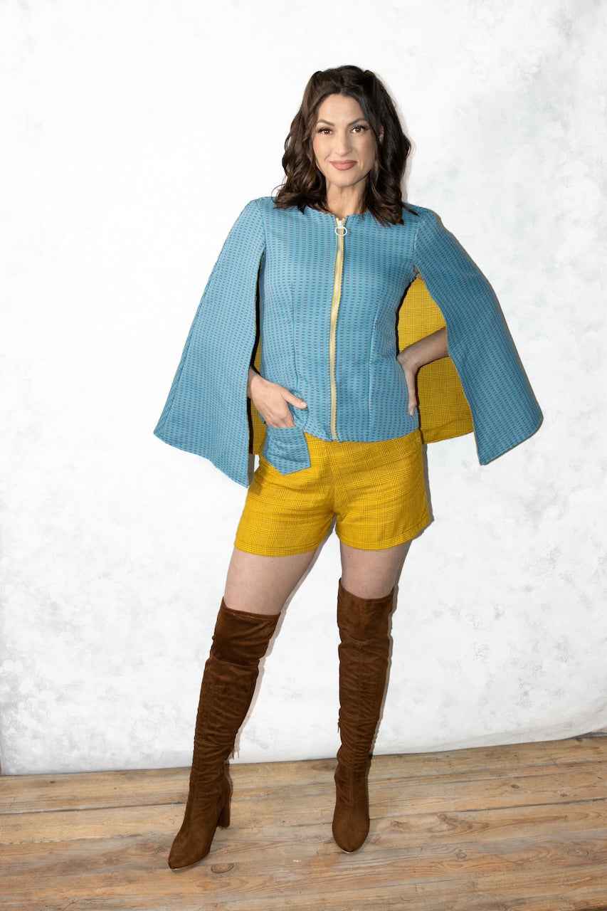 The "St Tropez" set is a must-have for jetsetters and retro lovers alike. With a vintage-inspired design straight from the 1960s, this fitted jacket with attached cape and short set will have you feeling groovy.
