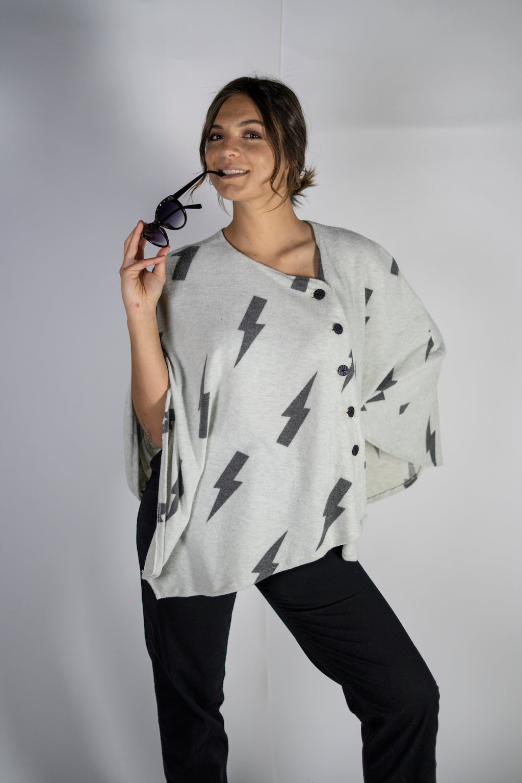 The "Thunderbolt" Knit Asymmetrical Poncho offers a funky and stylish twist on casual wear. Made with soft and cozy knit material, it provides both comfort and fashion. The asymmetrical design adds a unique touch.