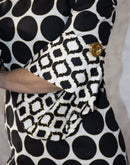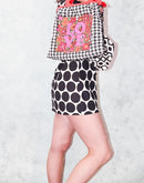Black Polka dots lined in gold on a white background