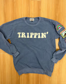 "Trippin" Sweatshirt with felt lettering One of a kind  crewneck sweatshirt Heavy, light vintage blue body Hand sewn custom felt lettering Trippin' lettering in cream felt Tourist patches on left...