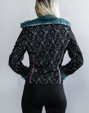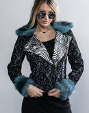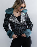 Forgotten Saints LA "Night at the Opera" Lace Moto Jacket with Faux Fur Collar One of a Kind Black Lace Body with Turquoise Underlay Black and White Satin Zebra lining...