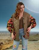 Olive green quilted jacket liner with floral brocade puff sleeves