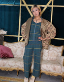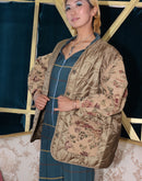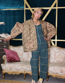 Olive green quilted jacket liner with floral brocade puff sleeves
