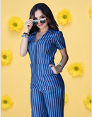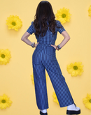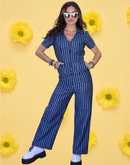 "Clockout" Coverall Striped Denim  2 front pockets Ankle length One of a kind  Zip up front Chest- 36" Waist- 30" Hip - 34" Front rise - 23" Inseam - 26"...